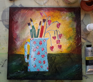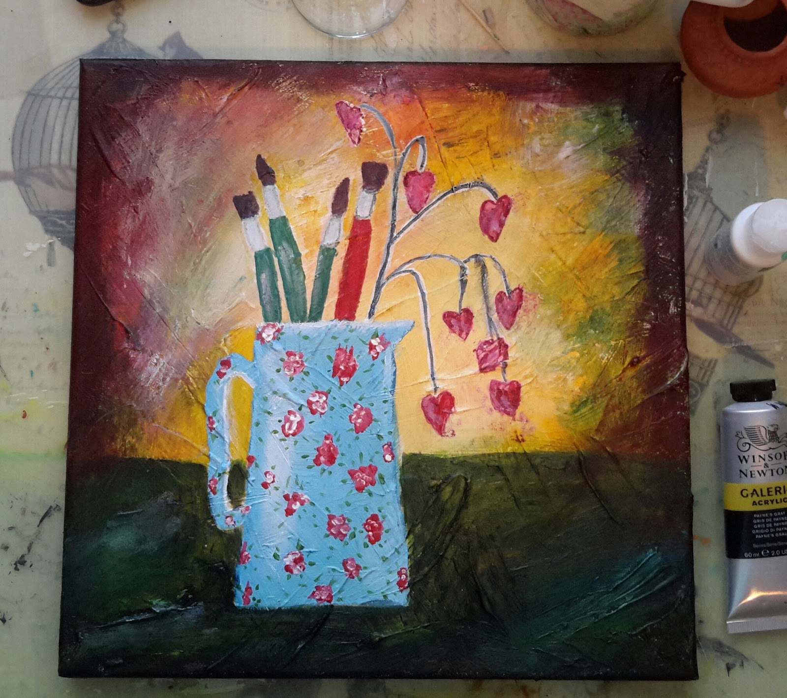 This is my attempt at still life since school as helped by an excellent lesson via Wanderlust with Teresa McFayden. I have always steered clear of still life as I am not an accurate in drawing and painting. However she explained what to do over 3 videos and it was really inspiring. This is my jug of brushes and some hearts. Hope you like. I am so enjoying this course, there is just so much to learn and fun to be had doing it.